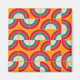 Padrão moderno do século médio. As formas circulares simples giram aleatoriamente. Esquema de cores super e vívidas em laranja, vermelho, azure e bege.