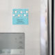 Íman de eventos com um padrão de gato fofo, colocado sobre um fundo azul e decorado com arco-íris e estampas de pata e muito mais.