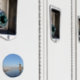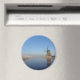 Imã fotográfico redondo com uma paisagem no campo, nos Países Baixos, no inverno, com um moinho de vento, gelo no rio e foscos, sob um céu azul claro.