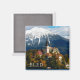 Foto-ímã de Souvenir da pequena ilha, com igreja cercada por árvores em cores de outono no lago Bled, com neve ao fundo nos picos dos Alpes Julianos no outono, na Eslovênia, com o tekst: "Sangado".