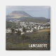 Uma paisagem da ilha de Lanzarote, Canárias, Espanha. Montanhas ao fundo e uma visão panorâmica de uma típica aldeia com casas brancas.