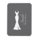 Magnet feito com uma cinza de fundo. Uma ilustração gráfica de um elegante vestido branco pendurado num cabide. Design minimalista simples.