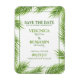 Estes salvam a data em que os imãs de casamento são perfeitos para qualquer casal planejando uma celebração romântica de casamento na praia. A design apresenta as tendas folhas de palma verde tropical sobre um fundo branco simples e limpo, com uma fronteira e uma redação coordenadas. O design simples pode ser personalizado para se adequar ao seu evento especial e será o anúncio perfeito para qualquer festa temática na praia, incluindo chás de panela, noivados, chás de casamento, festas de aniversário e muito, muito mais.
