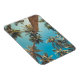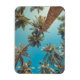 Esta foto mostra uma foto para cima de palmeiras contra um céu azul.