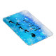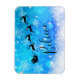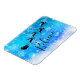 Íman de Natal - estilo flexível, com uma silhueta preta de papais noeis cavalgando em seu trenó sendo puxado por sua rena voando pelo céu. Acredite que está escrito em uma fonte de script de tendência. O fundo é um design de floco de neve gelado azul gelado.