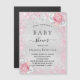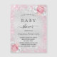 Um chá de fraldas moderno, elegante, celebrando uma menina. Fundo metálico de aspecto fino prateado decorado com brilho falso rosa, faíscas e flores. Personalize e adicione um nome e detalhes da parte. Letras pretas coloridas. Pode ser usado como lembrete Salvar a Data para seu convidado.