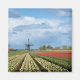 Fotoímã de Souvenir com uma paisagem com moinho de vento e tulipas amarelas e vermelhas sob um céu nublado no campo holandês, num belo dia de primavera na Região do Bulb, Países Baixos.