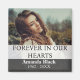 Um design simples, mas elegante, que apresenta uma imagem do seu ente querido com o texto "para sempre em nossos corações"—adiciona nome e datas. Sobreposições brancas e cinzas transparentes com cores de texto alternadas.