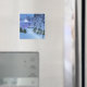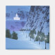 Um cheio de paisagem de fantasia 3D de neve brilhante e luzes de fada mágicas. Uma fileira de lâmpadas brilhantes ilumina o rastro através de uma passagem de montanha nevada encharcada por golpes rochosos. O brilhante caminho coberto de neve é mergulhado em árvores de abetos escuros. Do outro lado da fenda, um castelo de fada brilhante translúcido aguarda o viajante encantado em sua jornada para a feira.