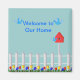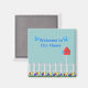 Um magnata e belo ímã de boas-vindas com um fundo azul alegre. Cerca de piquete, casinha de pássaros, pássaros e tulipas fazem disso um charmoso ímã de estilo country para sua casa ou um presente. Você pode editar o texto e a cor do plano de fundo, se desejar.