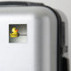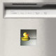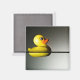 Um tiro bonito de um pato de borracha flutuando na água contra um fundo prateado.