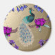 Um pavão colorido é empoleirado num galho adornado com flores vibrantes. O fundo apresenta um tom dourado com detalhes texturizados, melhorando a elegância geral da cena.