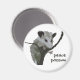 Agarrado a um galho macio, esticado à mão, este gambá espalha uma mensagem de paz. Coloque este ímã redondo ou quadrado na sua geladeira ou dê-o a um amigo num gesto de boa vontade.