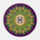 Uma coroa colorida de penas de pavão é personalizada com os Peixes de sinais Zodiac — O Peixe. Este símbolo zodíaco é para qualquer nascer entre 19 de fevereiro e 20 de março.* Estas brilhantes cores da pena de pavão são adequadas para o fundo escuro e claro (beringela mostrada aqui). *Fonte: www.astrology-zodiac-signs.com