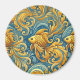 O design apresenta um peixe dourado vibrante com escalas laranja e ouro brilhantes, elegantemente detalhado com barbatanas que dão a impressão de movimento. O fundo é um azul sereno com padrões macios e ondulantes, parecidos com o suave fluxo de água. O contraste entre o peixe-dourado brilhante e as ondas azuis ondulantes faz o peixe se destacar, criando uma dinâmica cena aquática que evoca a sensação de que o peixe nadava graciosamente através da água.