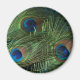 Fotografia de penas de pavão vibrante. Estas três penas têm uma bela cor. O fundo verde mostra as cores nos olhos da pena de paz