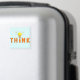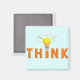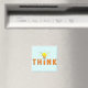 Um simples design que diz "Pense" com uma lâmpada a apontar a letra "I" em amarelo e laranja. Há linhas ondulantes ao redor da lâmpada que poderiam representar o cabelo deskempt de Albert Einstein.
