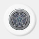Um pentáculo de pagã de energia feminina prateada cercado por um anel prateado num escudo de madeira prateada. Chalices, um medalhão central, joias de água azul, deusas triplas e rede celta. Designs por Naumaddic Arts.