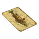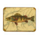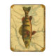 Esta impressão ilustra um quadro artístico de um peixe-perca amarelo. O plano de fundo exibe um mapa geográfico antigo em cores bege claro. A estrutura marrom se assemelha a um padrão antigo de madeira com flores amarelas-vermelhas nas bordas. Um excelente extra para a sua coleção de pesca!
