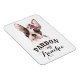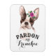 Este ímã flexível tem uma cor-de-água branca e marrom e giro, Bulldog Francês com um pequeno buquê de flores roxas, cor de pêssego, verdes e aquarelas e folhas sentadas sobre sua testa. O texto personalizável diz "Perdoe meu francês".