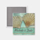 Duas conchas marítimas contra um fundo verde azul com noiva fácil de personalizar e o nome do noivo. Design perfeito para casamentos de destino, Havaí, Tahita, Bahamas e muito mais.