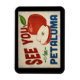 Um charmoso imã de geladeira de viagens vintage da Petaluma California com uma adorável maçã vermelha, junto com um texto divertido no estilo retrô que diz, "Veja você em Petaluma"