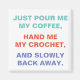 Um presente engraçado para os croqueteiros. "Apenas me sirva meu café, me entregue minha crochê, e lentamente de volta."