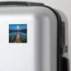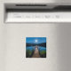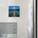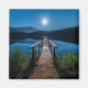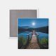 Um ímã com uma bela fotografia de um píer de madeira esticado sobre um lago calmo. O céu noturno coberto de estrelas e uma bela lua de cheio.