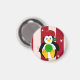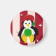 Um pinguim bonito vestindo um chapéu vermelho e segurando um ornamento verde. Um fundo de faixas vermelhas e rosas claro com pequenas estrelas brancas.