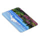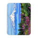 O trabalho de bruxaria imaginativo do artista e cores vívidas transportam espectadores para uma versão encantadora da selva do Alasca que apresenta a montanha de gelo com floresta sobre fundo azul-céu.