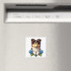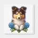 Um trabalho de arte de um filhote giro rodeado de flores azuis vibrantes contra um pano de fundo escuro, evocando calor e ternura.