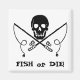O crânio clássico de Jolly Roger e cruzamentos, mas com polos de pesca cruzados. Legenda: "Peixe ou morra!"