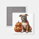Uma ilustração detalhada de um cão pitbull sentado ao lado de abóboras de Halloween esculpidas, mostrando um tema festivo e lúdico de Halloween
