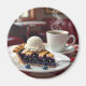 Íman bonito com uma ilustração da torta de mirtilo com o derretimento do sorvete de baunilha em cima com uma xícara de café quente no restaurante.