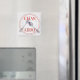 Este ímã de máquina de lavar louça ilustra uma placa janta branca com uma faixa vermelha e uma borda vermelha texturizada, e fotos de um garfo e colher na placa. O prato se senta sobre uma cinza texturizada que parece granito. Ele diz CLEAN em vermelho em um dos lados da placa, com a palavra DIRTY, em letras vermelhas "sujas", no outro lado.