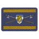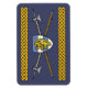 Polleaxes medievais tardias são cruzadas atrás de um escudo em forma de aquecedor que carrega um leão heráldico nesta design original por Richard H. Fay.