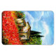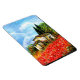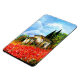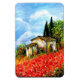 Paisagem da Toscana, beleza colorida, vibrante e expressiva dos campos rurais italianos e da papoila vermelha, bela flora de Verão em verde claro, amarelo, castanho, azul, branco, prados, campo de flores, cinza e oliveiras, antiga casa de fazenda rustica sob o céu azul e nuvens brancas. Pintura acrílica em canvas.