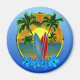 Belo pôr do sol da praia atrás de pranchas de surf e palmeiras, enquadrado com flores de bambu e hibisco.