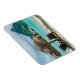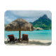 Íman retangular de souvenir de um parasol matado e de duas cadeiras solares em uma praia de areia branca em um luxo de bungalow submarino na clara lagoa azul da ilha pacífica de Bora Bora, perto do Taiti na Polinésia Francesa.