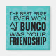 Texto do estilo tipográfico moderno para o seu melhor amigo Bunco. O sentimento Bunco diz: "O melhor prêmio que ganhei em Bunco foi a sua amizade. Fundo de flor modular acentuado com texto preto. Presente perfeito como prêmio Bunco.