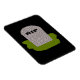 Este incrível ímã apresenta uma lápide de cinza com RIP no texto preto pingando nele, parado em um pedaço de grama verde. Ao lado dessa design mórbida, o fundo é preto.