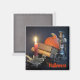 Livros magnéticos na cesta de colheita, ampulheta, abóbora de halloween e alho em sala escura