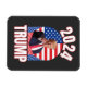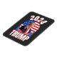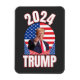 Presidente Trump Magnet. O Presidente Trump está em frente à bandeira americana. As letras e os números são descritos em vermelho.