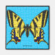 Desenho digital de uma borboleta Rabicho Amarela, mostrando suas asas pretas e amarelas contra um fundo azul.