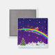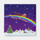 Bonita paisagem de neve na noite de Natal com árvores de Natal, casas, um boneco de neve, uma igreja, e Papai Noel voando sobre um arco-íris no céu noturno com flocos de neve.