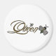 Rainha Bee Refrigeradora Magnet - Um ímã decorativo de texto de ouro com uma palavra cursiva: Rainha. Duas pequenas abelhas criadas com prata e brilho dourado incorporam o texto. O fundo é branco sólido.