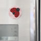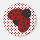 Uma joia doce, vermelha e preta está em um fundo de bolinhas vermelha.