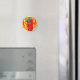 Um personagem de desenho animado de pimenta vermelho e quente. Design original. O fogo atira ao fundo. Ímanes personalizados. Ideia de decoração para amantes de comidas picantes.