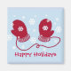 Um belo par de mitenes vermelhas com uma corda vermelha e pequenos flocos de neve. Um fundo azul macio com flocos de neve brancos em vários tamanhos e formas. Diz "feriados felizes" que isto pode ser alterado se assim o desejar.
