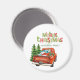 Caminhão vermelho com presentes, e pinheiros em fundo branco.